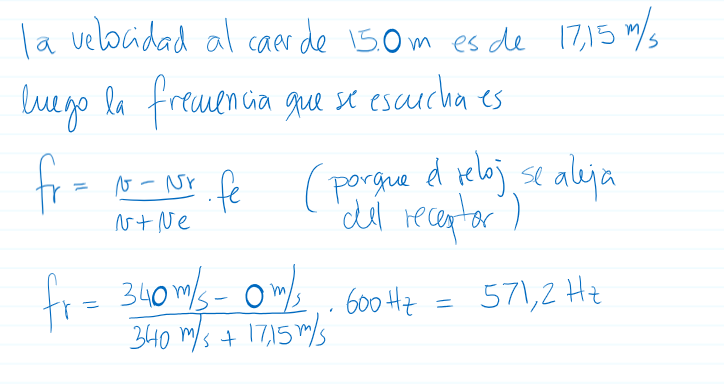 Su radio–reloj lo despierta con un sonido estable e irritante de 600 Hz de frecuencia. Una mañana funciona mal y no se puede apagar. Frustrado, arroja el radio–reloj por la ventana de su dormitorio en el cuarto piso, a 15.0 m del suelo. Suponga que la rapidez del sonido es de 343 m/s. Mientras escucha al radio–reloj que cae, ¿qué frecuencia escucha justo antes de que lo oiga chocar con el suelo?