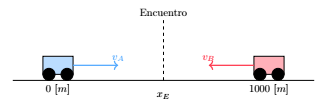 $\begin{align} x_A &= x_B \\ 0 + 20t &= 1000 - 30t \\ 50t &= 1000 \\ t &= 20s \end{align} $Entonces el punto de encuentro ocurre a los 20 s.