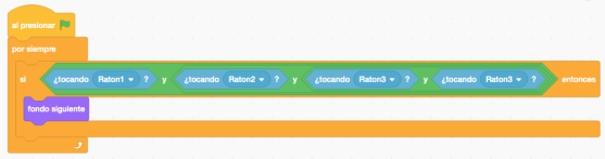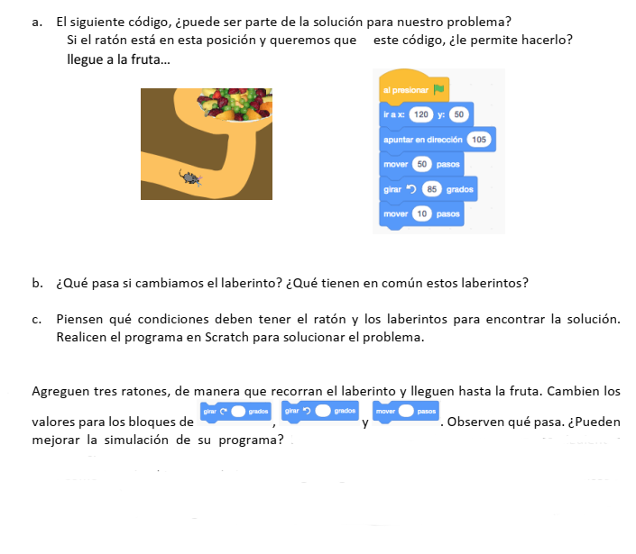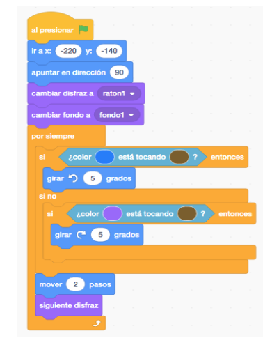 Funcionalidad del programa en Scratch: ratones detectan paredes y buscan meta.